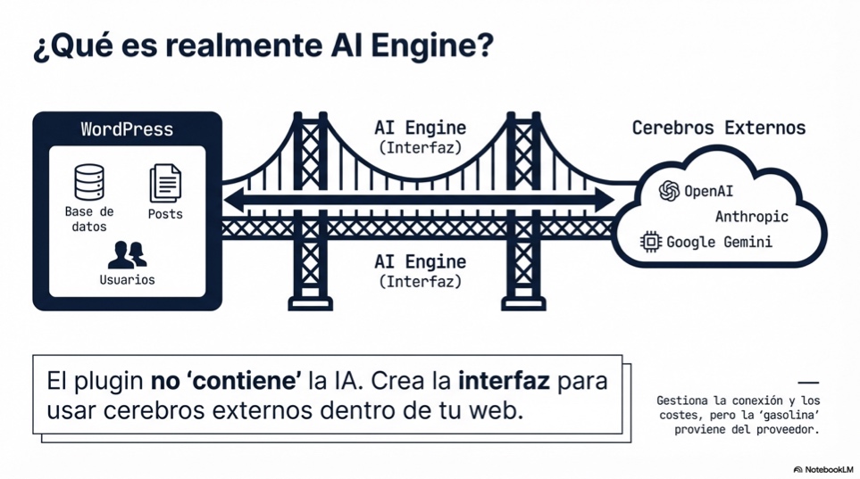 Es común confundir AI Engine con un simple chatbot, pero es mucho más. AI Engine actúa como un puente entre tu instalación de WordPress y los modelos de inteligencia artificial más avanzados del mercado, como los de OpenAI (creadores de ChatGPT), Anthropic (Claude) o Google Gemini,.