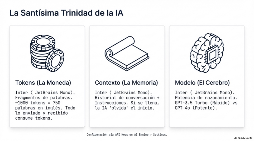 Una vez conectado, es crucial entender tres conceptos que verás repetidamente en la interfaz y que son la base de la comunicación con la IA: