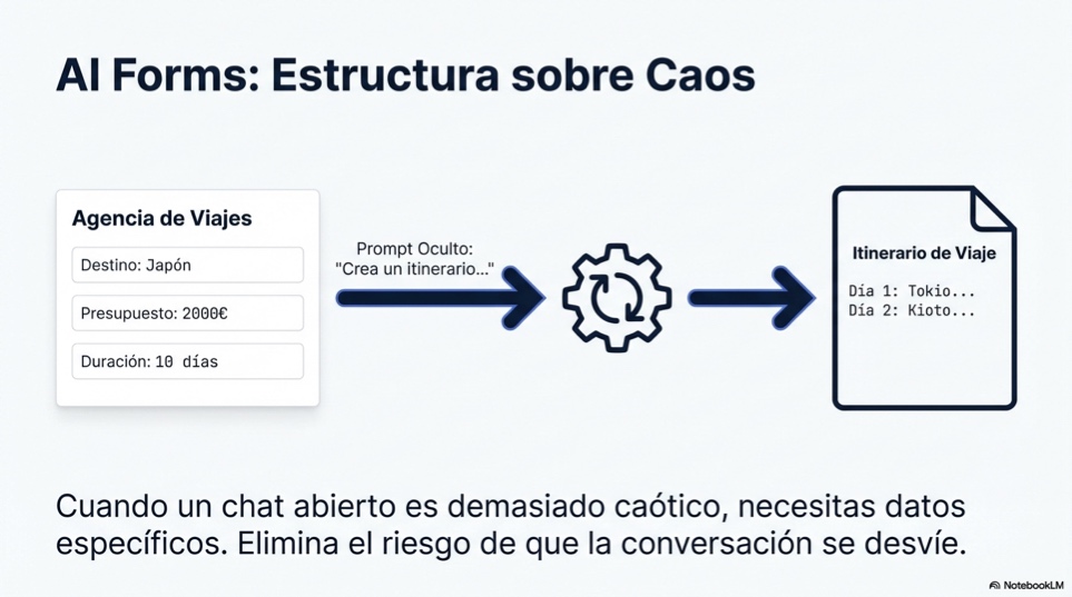 El resultado es que la IA genera una respuesta perfecta y formateada basada en los inputs del usuario, sin riesgo de que la conversación se desvíe.