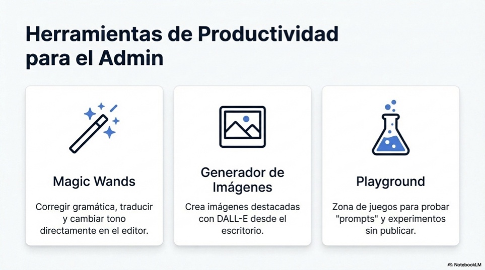 • Generador de Imágenes: Conectado a modelos como DALL-E, puedes pedirle que genere imágenes destacadas para tus artículos directamente desde el escritorio de WordPress y guardarlas en tu biblioteca de medios,.