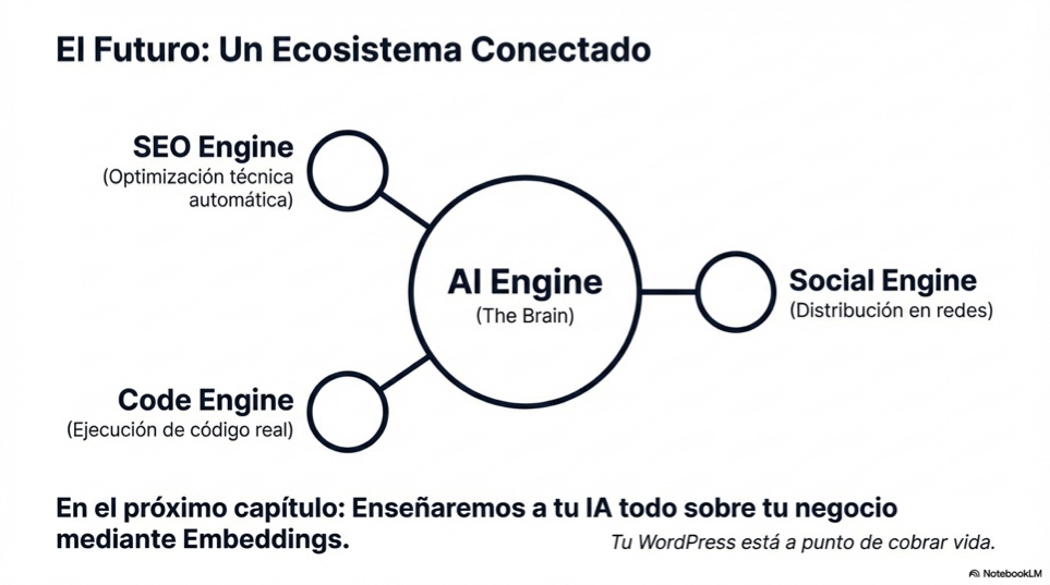 Hasta ahora, hemos visto a AI Engine como un cerebro aislado que «habla» o «escribe». Pero, ¿y si ese cerebro pudiera «hacer» cosas en tu web? ¿Y si pudiera ver tus datos de ventas, optimizar tu SEO automáticamente o publicar en tus redes sociales?