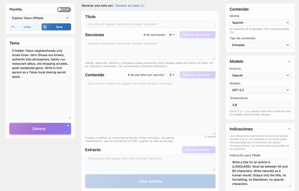 • Generador de Contenidos (Content Generator): Esta es la funcionalidad que buscabas si necesitas escalar tu blog. El plugin incluye un módulo específico que te permite generar artículos completos y optimizados para SEO en cuestión de segundos. Simplemente defines el tema o el título, y la IA se encarga de estructurar el contenido, redactar los párrafos y dejarlo listo para publicar, todo adaptado a tu sitio.