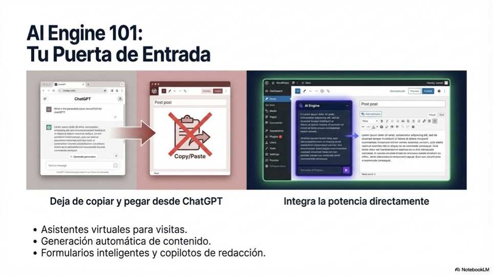 El plugin no «contiene» la IA; más bien, crea una interfaz visual y técnica para que puedas usar esos cerebros externos dentro de tu web. Esto te permite: